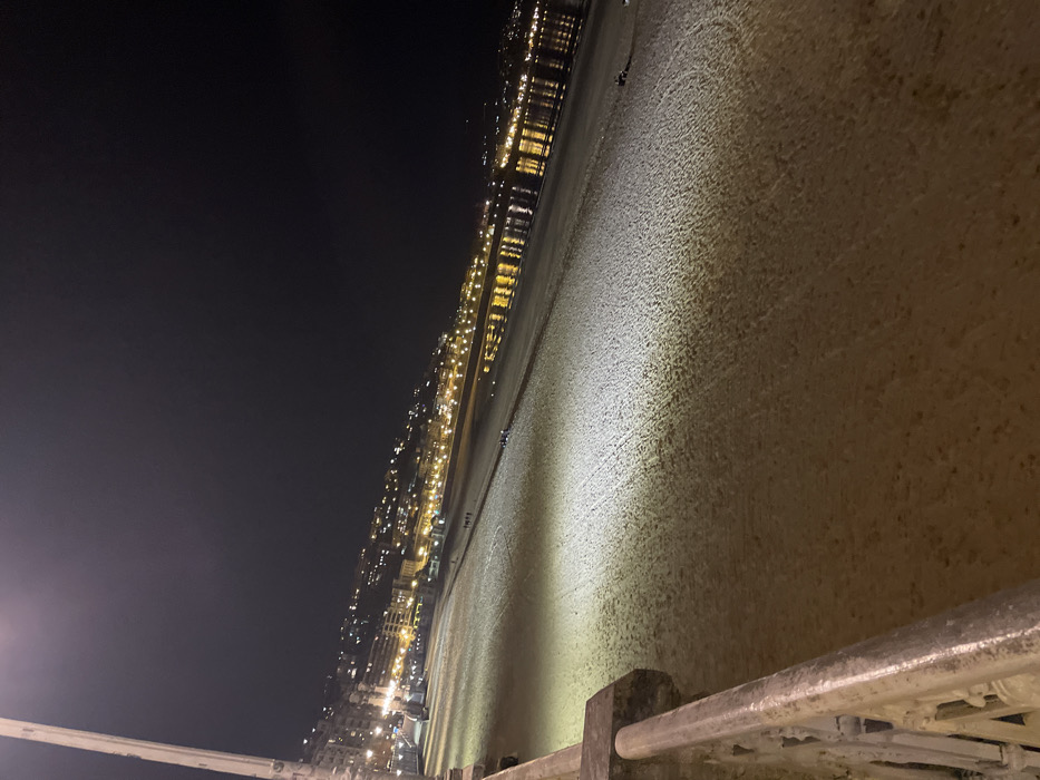 A nighttime view from an elevated position looking out over a beach and coastline. The dark sky contrasts with the bright lights of buildings lining the coast. A beam of light shines across the beach. A railing is visible in the foreground, suggesting the vantage point is a bridge or balcony. The composition is tilted to the side.