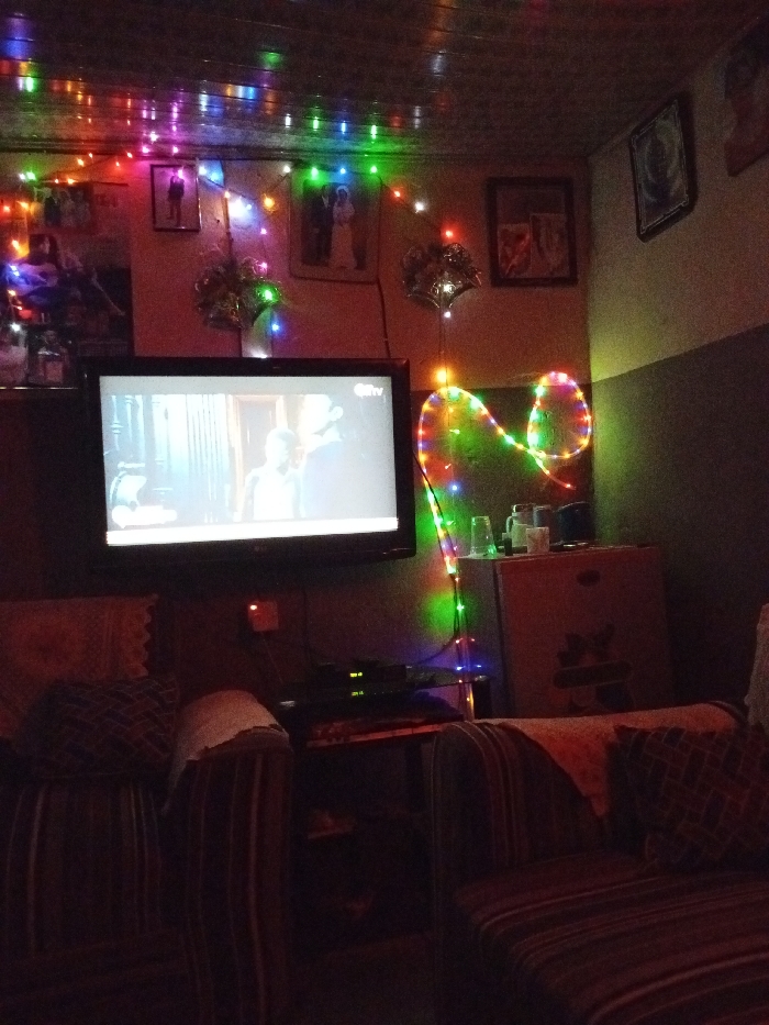 A dimly lit living room features a wall-mounted TV displaying a scene with two figures. The room is decorated with colorful string lights. Several framed pictures hang on the wall above the TV. Below the TV, there's a small table with electronic devices. Two striped armchairs with patterned pillows flank the area. A small refrigerator stands next to the right armchair, and some mugs rest on top of it. The overall ambiance is cozy and somewhat cluttered.