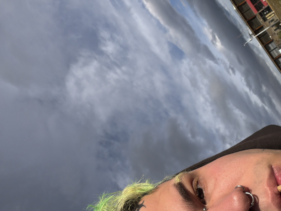 The image depicts an outdoor, angled close-up of an individual positioned in the left third of the frame, with a cloudy sky and distant architecture comprising the background. The person exhibits bright lime-green and yellow dyed hair, light skin, and dark patterns, possibly tattoos, visible on the forehead near the hairline. They have a silver barbell piercing above their left eye and two silver ring piercings in their nose, specifically a septum ring and a ring in the left nostril. The individual is wearing a dark-colored hooded garment, with the hood visible on the right side of their face. A light-colored cylindrical object, possibly a cigarette, is held between their lips. The sky occupies the majority of the frame, featuring a dense mixture of grey and white clouds with intermittent patches of blue sky, indicative of partial cloud cover during daylight hours. In the lower right background, a multi-story building is visible, characterized by a light-colored base, horizontal bands of dark-framed windows, and a distinct red horizontal stripe on an upper level. Vertical structures, possibly poles or antennas, stand in front of the building. The scene is located in the city of Ushuaia, Argentina.