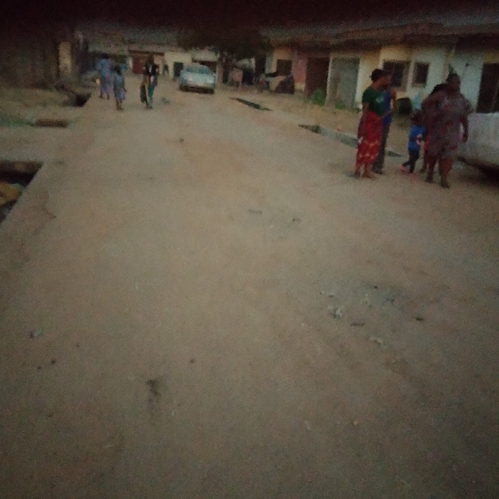 A street scene with a dirt road running through it. On the sides, buildings with visible windows and doors are seen. Several people are walking along the road. In the distance, a car is parked. The lighting suggests it may be dusk or dawn, as the scene appears somewhat dark. There are also noticeable cutouts or trenches along the side of the road.