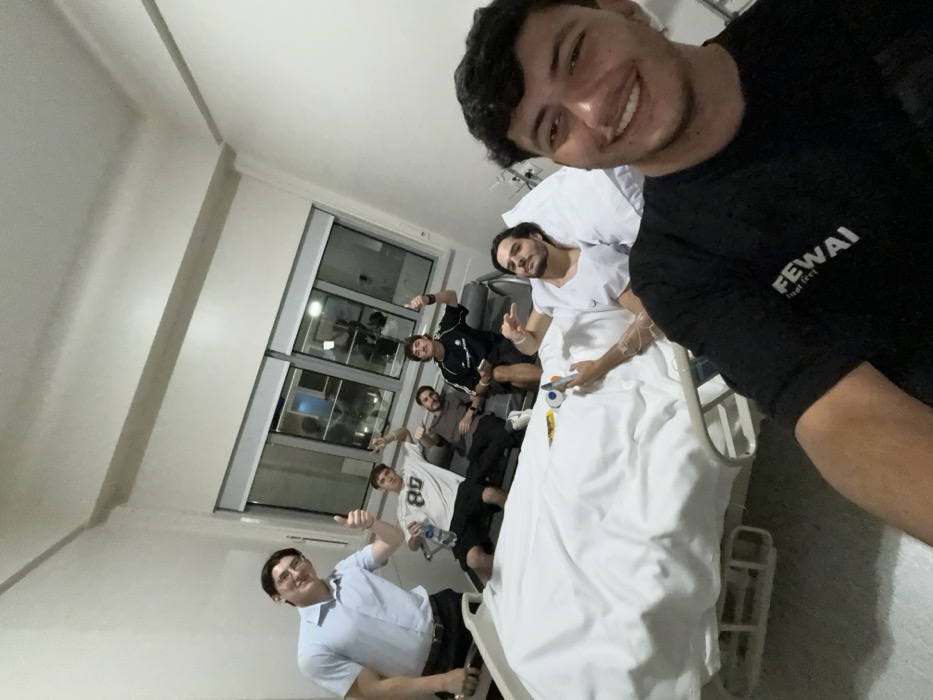 A group of six men are posing for a selfie in what appears to be a hospital room. One man is lying in a hospital bed, connected to an IV. The person taking the photo is in the foreground, wearing a black t-shirt. The other men are giving thumbs-up gestures and standing or sitting by the window or the bed. The room is brightly lit with a large window and white walls.