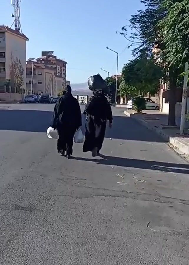 Two women dressed in black abayas walk away from the camera down a city street. The woman on the right carries a large black bag on her head. The woman on the left carries two white plastic bags. The street is paved and bordered by buildings and trees. Cars are parked along the street. The sky is clear and blue.