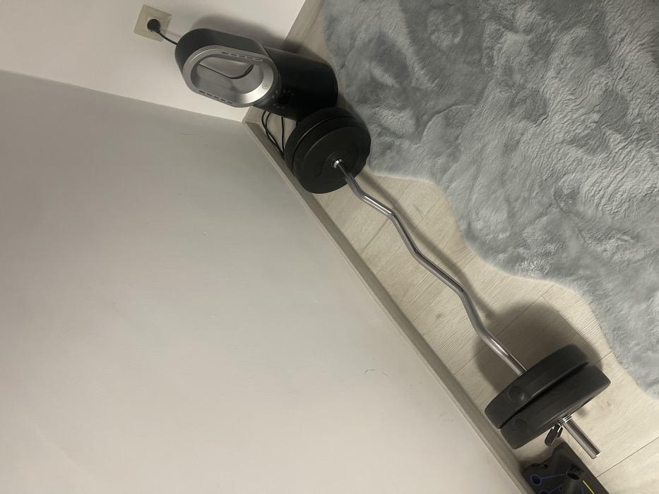 An indoor room in Varna, Bulgaria, is depicted from an elevated angle, showcasing a corner with plain white walls and light-toned wooden floorboards. A light gray, irregularly shaped faux fur rug partially covers the floor. In the corner, a black and silver Dyson Pure Cool Link fan/air purifier stands upright and is plugged into a two-prong electrical outlet mounted on the wall. A chrome-plated EZ curl bar, equipped with two black weight plates on each end, lies diagonally across the floor, extending from the lower-left foreground onto the gray rug. A section of black and yellow fitness equipment is visible in the bottom-left corner, resting against the wall. No individuals are present in the scene.