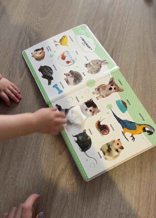 A toddler is pointing to a picture of a cat in a children's book. The book is open and lying on a wooden floor. The book has pictures of different pets, with their names in Russian. A mother's hand is visible in the bottom left of the frame. A yellow toy hammer is in the upper right of the frame. The toddler's right arm is pointing toward the cat. The book is titled "ПИТОМЦЫ" which translates to "Pets". The lighting is bright.
