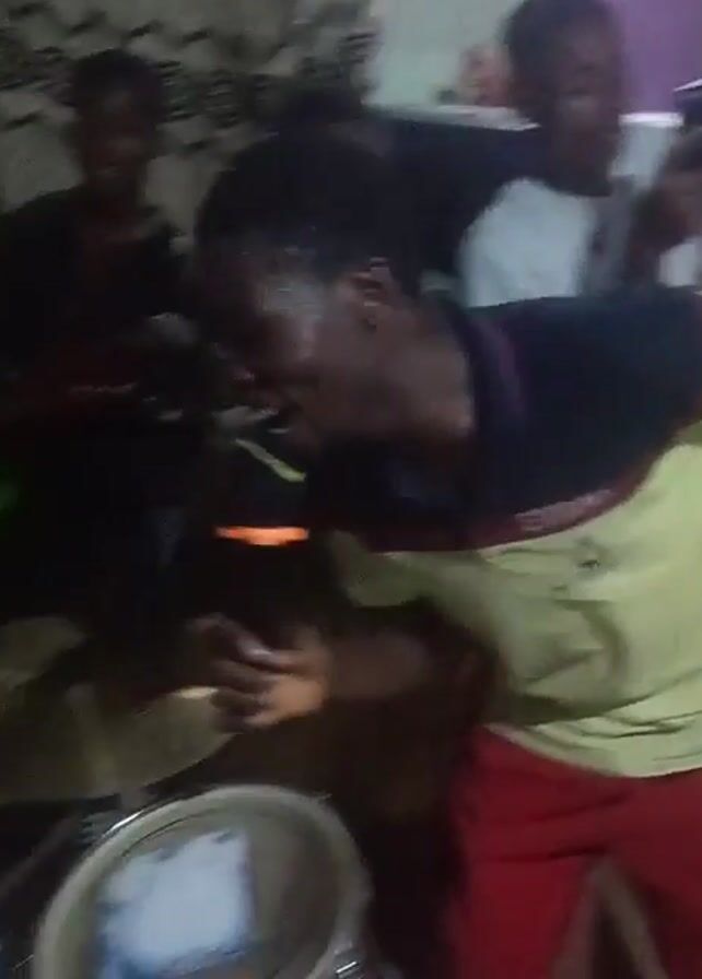 two young Black men playing percussion instruments. The first man, in the foreground, is wearing a black and tan short-sleeved shirt and red pants. He is animated, playing what appears to be a hi-hat and another drum. He is also singing or yelling. The second man, standing behind him, is wearing a white t-shirt and playing a set of three conga drums. They are in an enclosed space with curtains and what looks like a catering setup. A green plastic chair sits to the right. There are other people behind the musicians, but their faces are obscured.