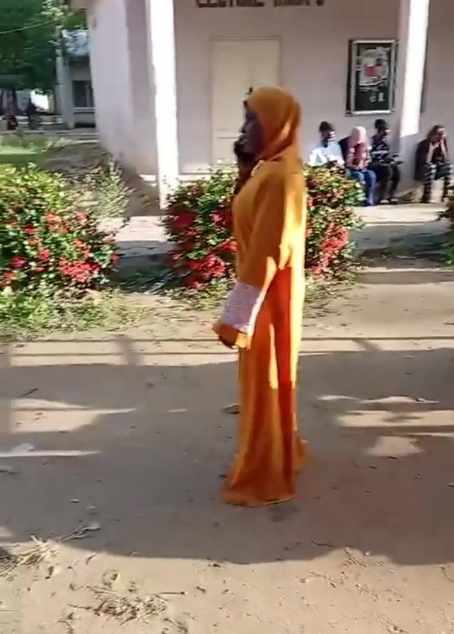 group of people gathered outside a building with the sign "Room 3" on it. Some people are sitting on benches under a shelter, while others are sitting on the ground. There are bushes with red flowers in the area. The ground is dirt.