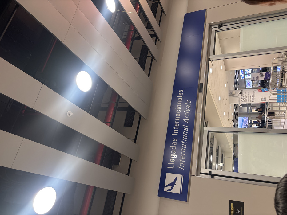 An image depicts the entrance to the International Arrivals area at Jorge Chávez International Airport in Callao, Peru