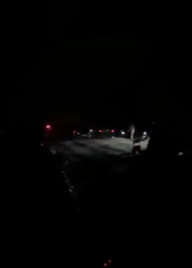 dimly lit scene at night with several people gathered. Car headlights and taillights are visible in the background, indicating vehicles are present. Individuals are milling around, their actions not entirely clear due to the low light. The environment appears to be an outdoor area, possibly a road or open space.