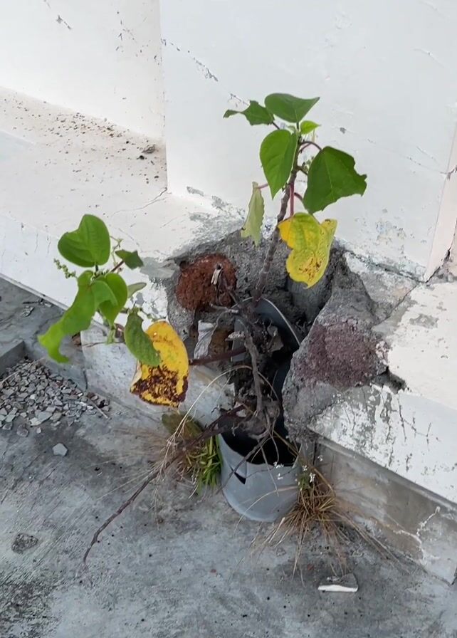 The camera pans around a neglected plant struggling to grow in a confined space. The plant, featuring green and yellow leaves, is precariously situated within a broken gray plastic pot wedged into a gap in a concrete structure. The surrounding concrete is cracked and damaged, and some loose rocks are visible, along with scattered debris. The background consists of a white wall and gray concrete ground.