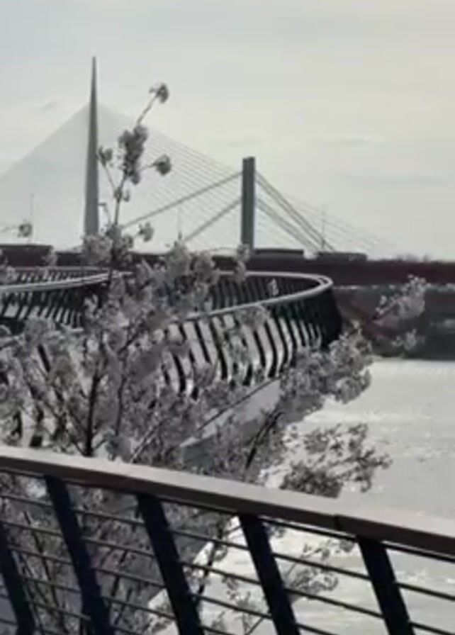scenic view of a modern city bridge on a bright, possibly winter day. The bridge is adorned with intricate metal railings and is flanked by a snow-covered tree branch. In the background, a larger suspension bridge stands tall against the pale sky. The river below reflects the sunlight, creating a shimmering effect on the water surface. The overall environment appears serene and tranquil, capturing the beauty of urban architecture against a natural backdrop.