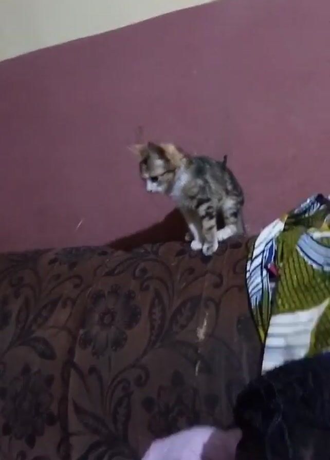 A small, tabby and white kitten stands on the patterned back of a brown couch. The kitten looks down and to the left. A woman wearing a pink shirt and with braided hair is sitting in front of the couch, partially obscured by the couch and kitten. The wall behind the couch is a two-tone color scheme, with a lighter, beige color on top and a darker, maroon color on the bottom. A patterned garment is on the right side of the couch.