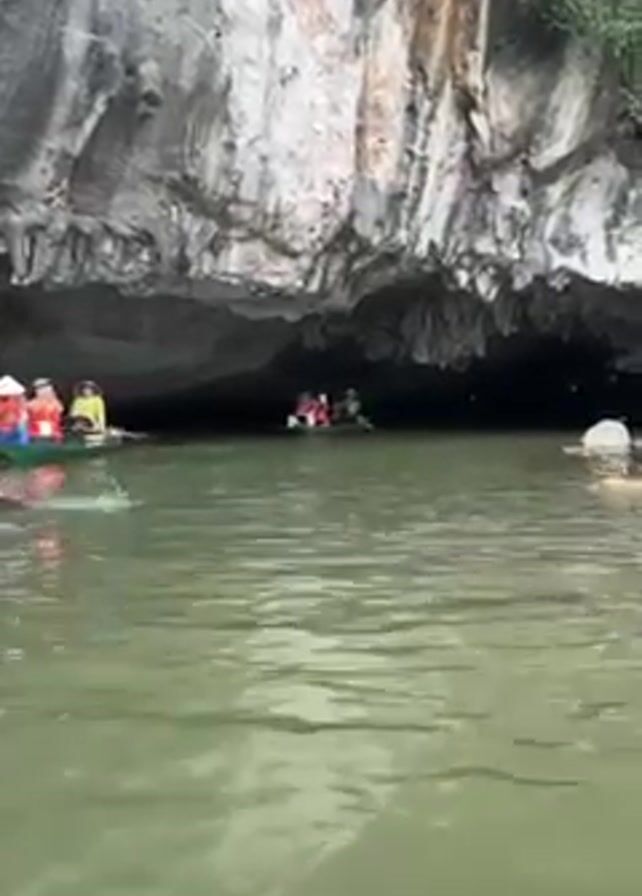 group of people in small boats, being rowed through a body of water, presumably a river or bay, toward the entrance of a large, dark cave in a cliff face. The cave is large and imposing, with a rough, weathered texture to the stone. The boats are narrow and appear to be traditional in design. The people are wearing life jackets and some have hats. The water is calm, with a greenish hue, and reflects the surrounding rock formations. The overall impression is of a scenic and perhaps tourist-oriented activity.
