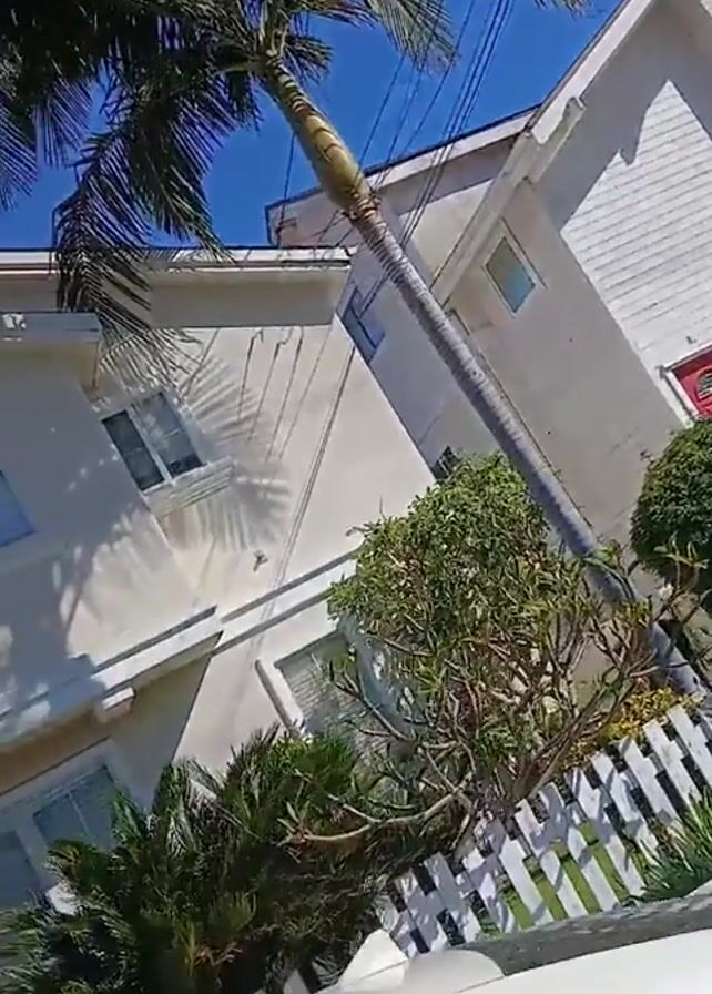 The camera, likely from a moving vehicle, captures a residential street scene on a sunny day with a clear blue sky. Focus is primarily on the houses lining the street, which are mostly two-story structures with white or light-colored exteriors. Palm trees are interspersed between the houses, casting shadows on the buildings. A white picket fence is visible in the foreground, separating the properties from the street. A car hood can be seen at the bottom of the screen, further suggesting the video was taken from a vehicle.