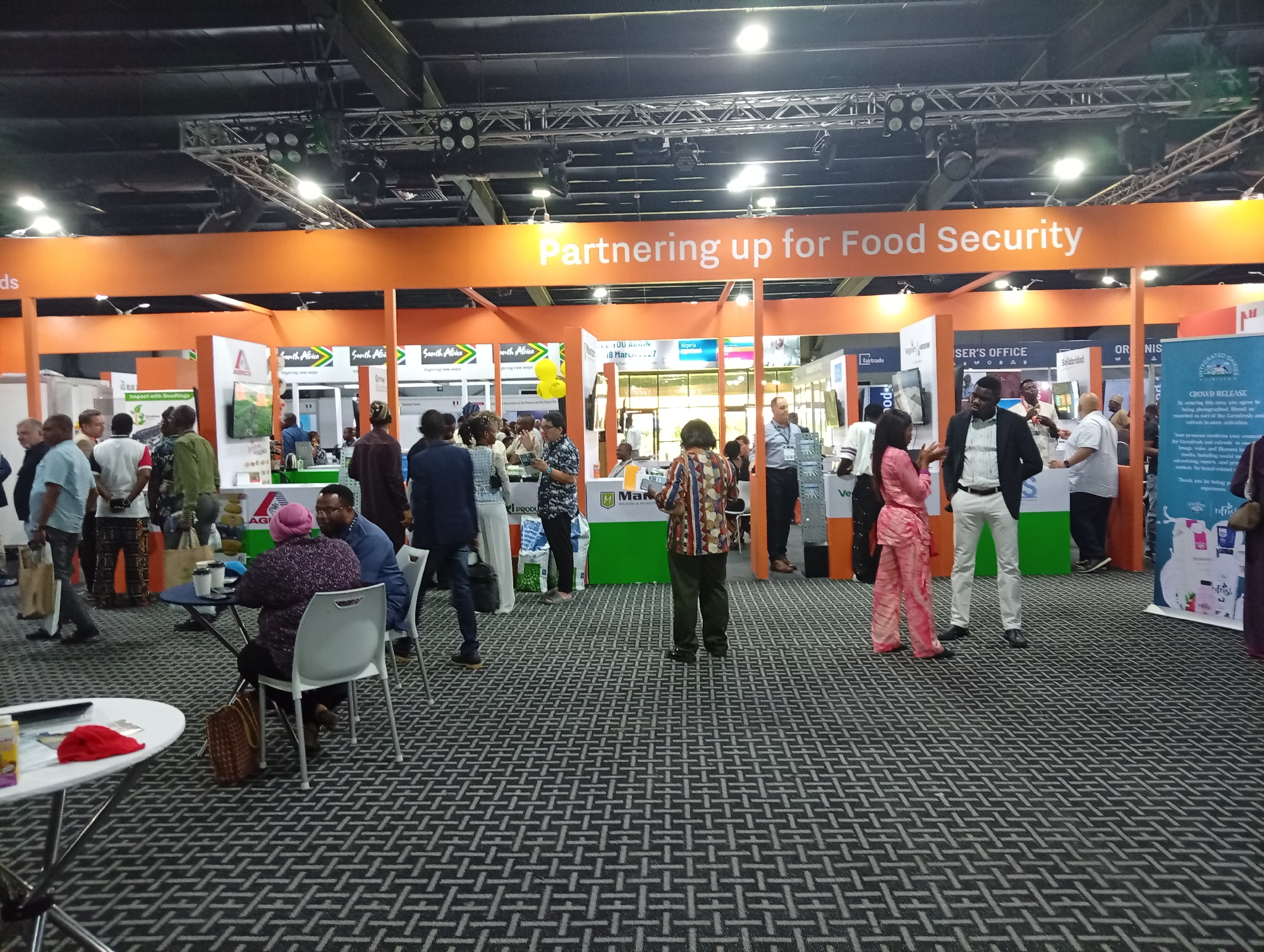 The scene depicts an active indoor exhibition hall in Itirin, Nigeria, populated by approximately 25-30 individuals. A large orange banner spans the upper midground, bearing the white text "Partnering up for Food Security." The flooring is a dark grey carpet with a repeating light grey geometric pattern. In the left foreground, two individuals are seated at a small, dark blue round table with two white chairs; one wears a purple patterned top and pink headscarf, while the other is in a blue long-sleeved shirt. Two white coffee cups are on their table, and a brown woven bag rests on the floor beside them. Several other individuals are in motion, walking across the patterned carpet. The midground and background feature numerous exhibition booths with orange vertical and horizontal structural elements, along with white backdrops and displays. Visible branding includes "South Africa" with a flag motif (repeated), "AGRICO," "Fairtrade," and "Integrated Dairies." Yellow balloons are present near one booth on the right. Attendees, primarily adults of African descent, are observed standing, conversing in small groups, and interacting with booth displays. Clothing varies from business casual attire, including shirts and blazers, to more vibrant and patterned garments, such as a pink patterned pantsuit worn by an individual on the right and a multi-colored patterned shirt worn by a person in the center. Overhead, exposed metal trussing supports multiple arrays of artificial spotlights, illuminating the event space.