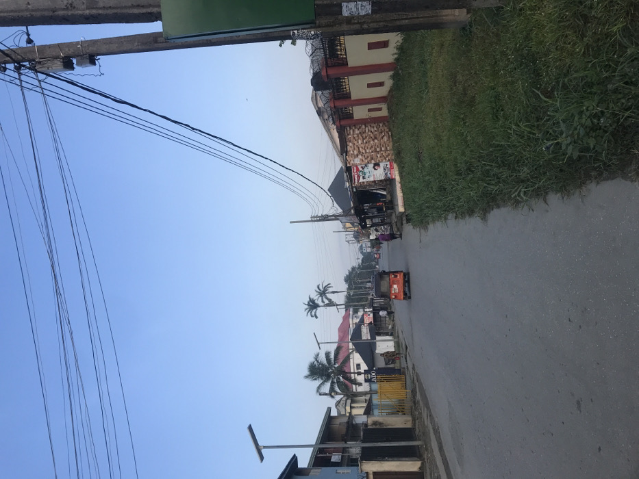 The image depicts a straight, paved asphalt road in an urban area of Uyo, Nigeria, under a clear, light blue sky