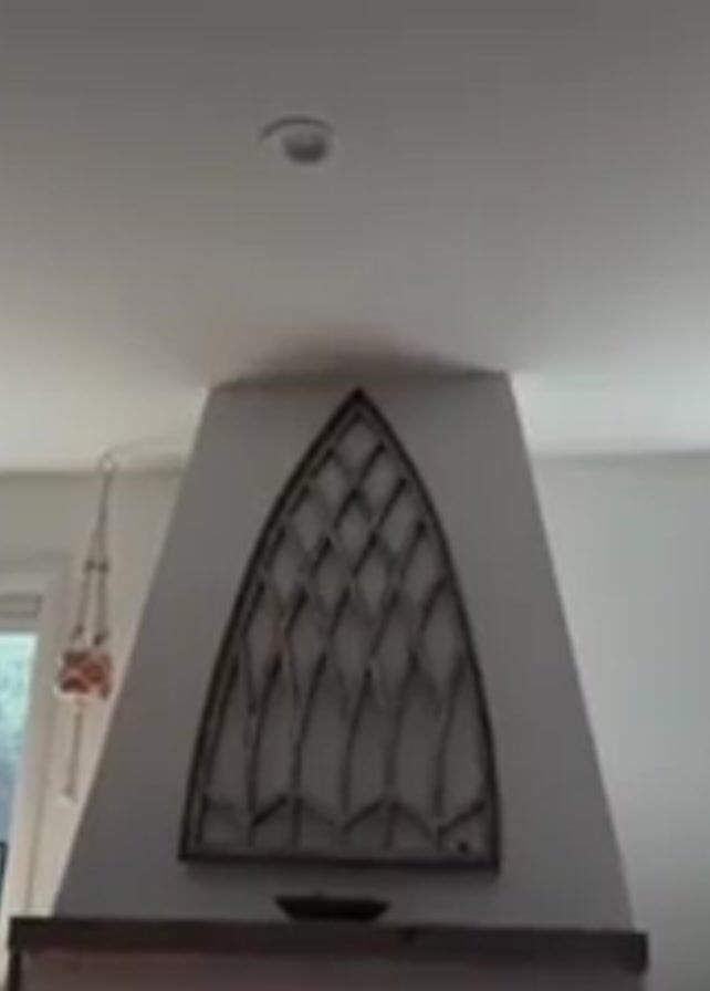 room with white walls, two windows, and a fireplace. The wall above the left window has the words "No WiFi" written on it. A hanging plant is in front of the window. The wall above the right window has the word "RELAX" written on it. The fireplace has a decorative gothic-style wooden piece on the wall above it.