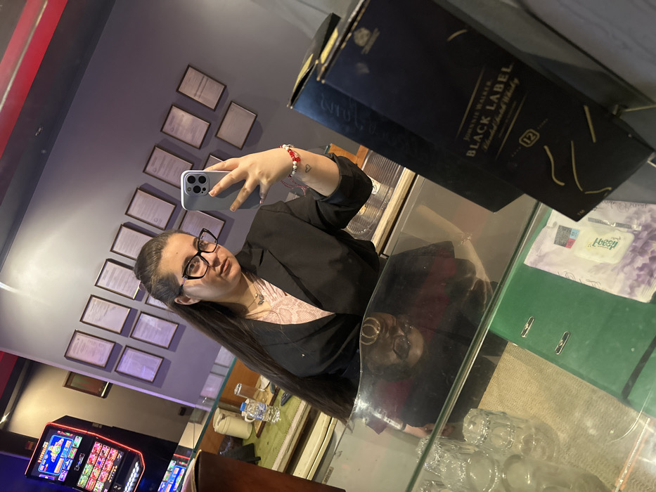 The scene is located within a commercial establishment in Primorsko, Bulgaria, depicting a young woman taking a selfie in a reflective surface. The female individual, positioned centrally, has long dark hair pulled back and wears black-framed eyeglasses, a black blazer over a light pink patterned top, a delicate necklace, and a red and white beaded bracelet with a red string on her left wrist. A small heart tattoo is visible on her left forearm. She holds a light grey smartphone with multiple cameras in her left hand, angled to capture her reflection. In the background, to the upper left, a brightly illuminated slot machine displaying colorful game graphics is visible. To the upper right, a grey wall is adorned with approximately eleven framed documents, arranged in two rows, indicative of licenses or certifications. The woman's reflection, distorted by the angle, is visible on a glass counter surface in the lower portion of the image. On this counter, to the right, two dark blue boxes of "Johnnie Walker Black Label Blended Scotch Whisky 12" years old are prominently displayed. Behind the glass counter, on a lower shelf, clear drinking glasses are stacked, alongside a white pitcher and a plastic bottle of water. Further below the counter, a green binder and some crumpled white material are visible.