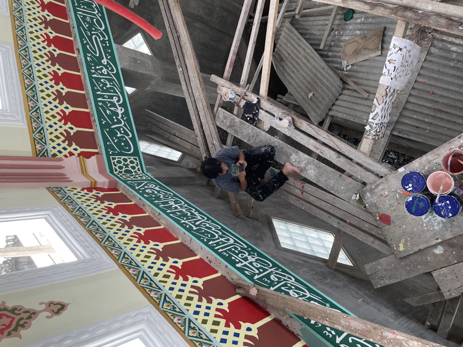 An overhead, high-angle shot captures an interior scene within a building under construction or renovation in Kumbang, Indonesia. A single barefoot male individual, dressed in a grey t-shirt and paint-splattered dark pants, is seated cross-legged on a wooden plank forming part of an extensive scaffolding structure. He is actively engaged with a smartphone, held in both hands, looking down at its screen. The walls display elaborate Islamic-style ornamentation. The upper section is cream-colored with light pink and gold decorative trim. Below this, a horizontal band features geometric and stylized patterns in yellow, light blue, red, and dark brown. A prominent green band, bordered in light blue, runs horizontally across the wall, showcasing intricate white Arabic calligraphy. Beneath the decorated sections, unfinished grey concrete walls are visible, along with multiple rectangular, textured glass block windows providing diffused light. On a lower wooden platform in the foreground, several open paint cans are visible, containing dark blue, light blue, light pink, and red-brown paints. A paintbrush is submerged in the pink paint. This platform is splattered with various paint colors. Near the seated individual on the scaffolding, a small white container and a dark cloth are present. Below the scaffolding, corrugated metal sheets, additional wooden structural elements, and debris are visible. A red cylindrical object extends diagonally into the frame from the upper right.