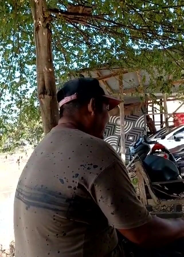 A man with a cap sits under a tree next to a river. The man is wearing a dark-colored t-shirt that has splotches and a thick stripe across the back. He is facing to his right, looking toward a building made of wood supports. A panel with black-and-white geometric designs leans against the side of the building. A motorcycle and a white car are parked nearby. The tree he is sitting under provides shade. The view from under the tree reveals the river.