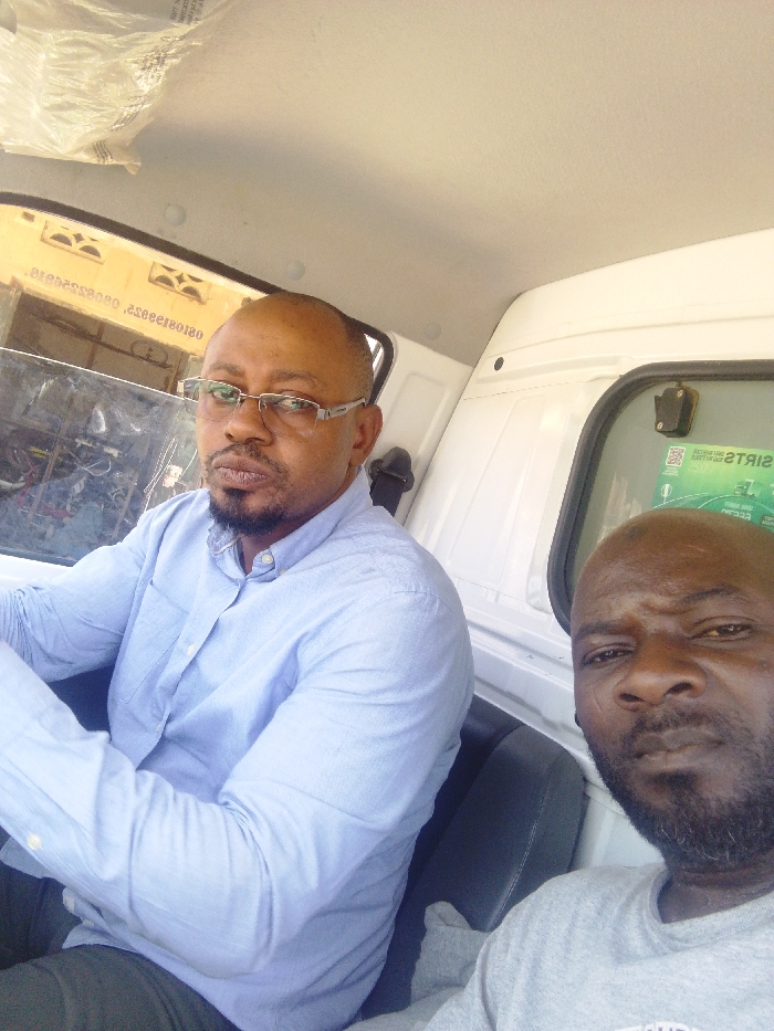 Two adult males of African descent are depicted inside a light-colored vehicle cabin in Hotoro South, Nigeria