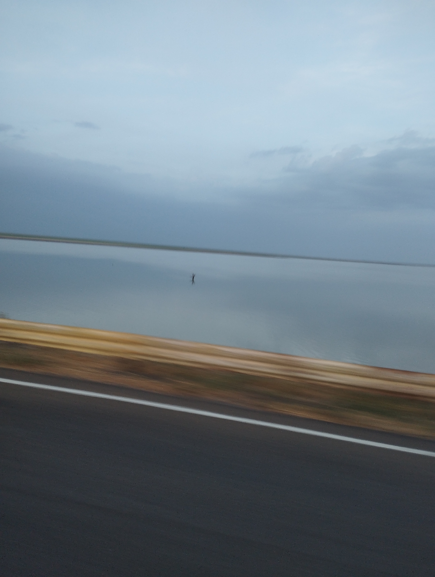 The image presents a landscape with a body of water reflecting a cloudy sky. A thin tree or stick-like object stands in the water. The foreground shows a blurred roadside with a white line marking its edge, suggesting motion, likely taken from a moving vehicle. The location is El Rastro, Venezuela.