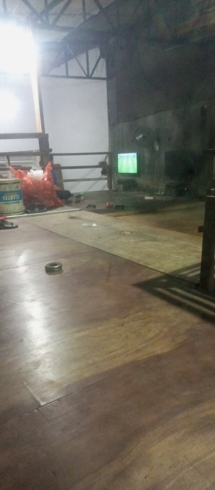 scene inside a building with a wooden floor and a metal railing in the background. There is a person, obscured by a red bag, sitting on the floor. There is a large red bag to their left and a metal paint can on the floor with the word "CASTER" visible on the can. There is a flat screen TV in the background with a football game playing on the screen. The building is located at the coordinates -7.351 latitude, 112.751 longitude. There is also a black object on the floor to the right of the can. There is a bright light coming from the ceiling above the person. There is a shadow of a railing cast on the floor. The shadow is slightly out of focus. There is also a roll of tape on the floor to the left of the center of the picture.