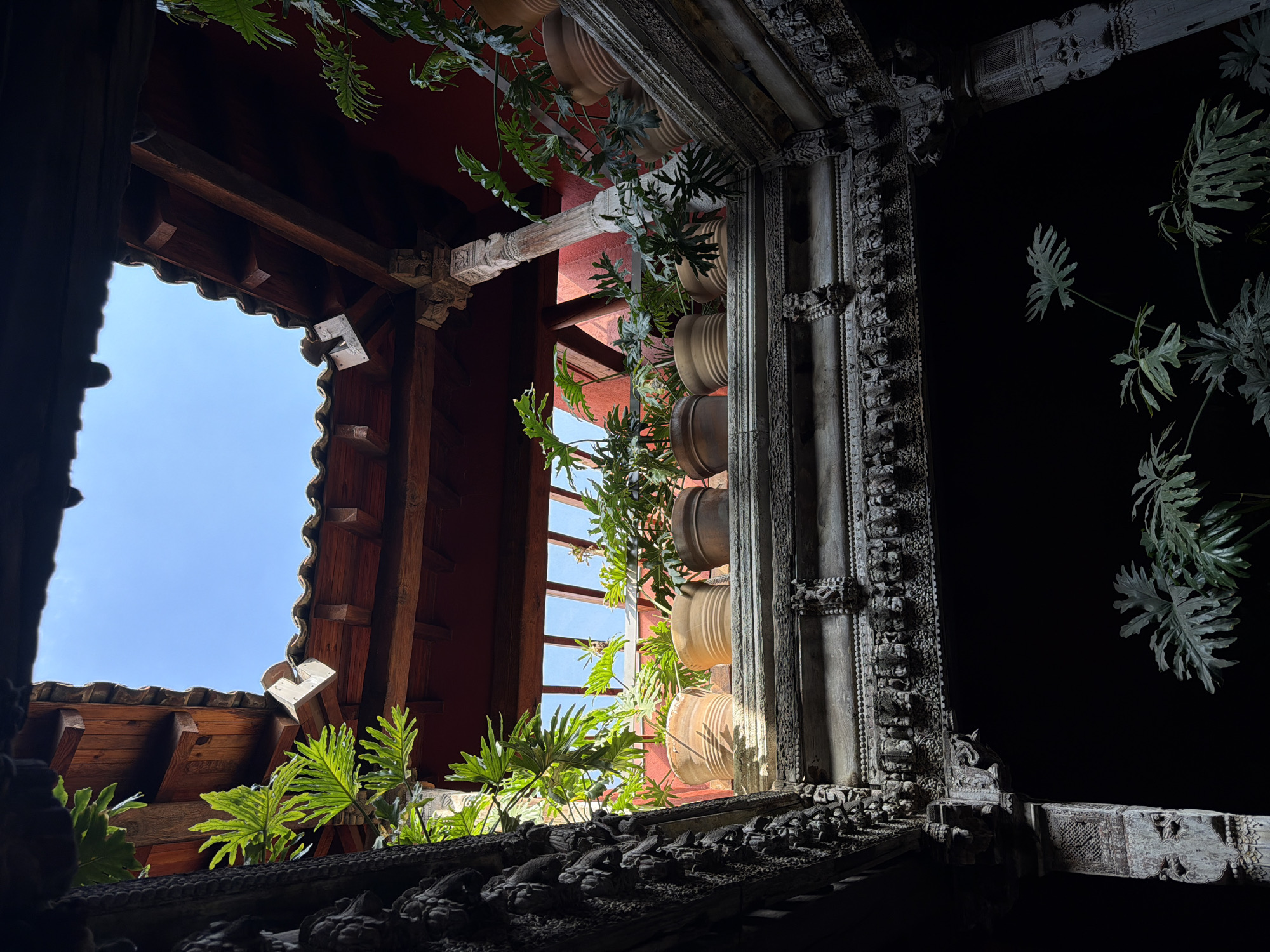The image presents a low-angle view of a building in Puebla, Mexico, featuring elaborate architectural details and lush vegetation. Visible is a square opening to the sky. The frame is made of dark brown wood with ornate carvings. Inside the opening, a section of the sky is visible. The building is adorned with rows of terracotta pots filled with green foliage, interspersed with ornamental wooden beams. On the right, an ornately carved, whitewashed pillar stands out, its intricate design casting shadows against the dark background. The bottom of the frame is heavily carved. A dark ambiance pervades the corners of the image.