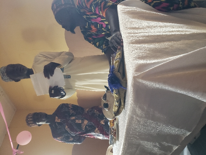 Three men stand around a table covered with a white cloth. One man holds a white sheet of paper and wears a white garment. Another man in a colorful, patterned garment is next to him. The third man, also in a colorful, patterned garment, stands on the other side of the table. On the table are a decorated hat, a plate, and other small items. A pink balloon on a string is visible in the background.