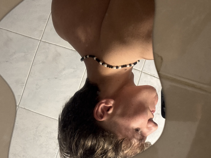 The image displays a reflection of a young male subject in a mirror. The male is captured in a left-facing profile, exhibiting short, light brown hair with faded sides. He is shirtless and adorned with a necklace consisting of alternating black and white spherical beads. His mouth is slightly open. The environment visible in the mirror's reflection features a wall covered in light-colored, possibly white or light grey, square tiles with darker grout lines. A curved, light-toned structure partially obstructs the reflection along the left edge of the frame. The scene is indoors. The location within the city of Troyan, Bulgaria, cannot be confirmed solely from the visual information provided in the image.
