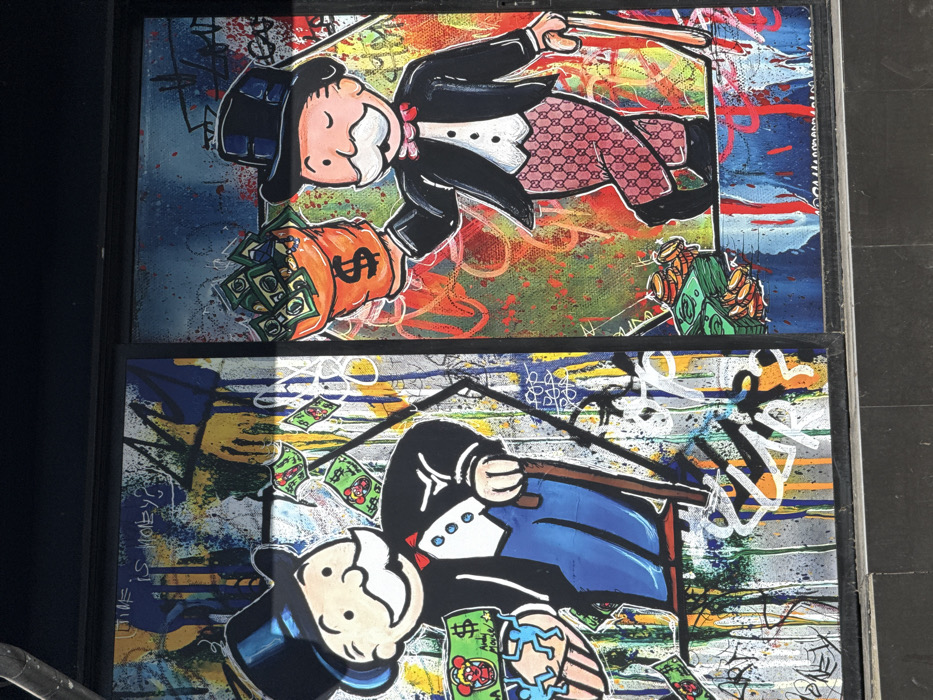 - "Two adjacent rectangular panels of street art, featuring pop-art style depictions of Rich Uncle Pennybags (Monopoly Man), are displayed on a building facade in Sofia, Bulgaria" by FM-mnNz92, licensed under CC BY 4.0