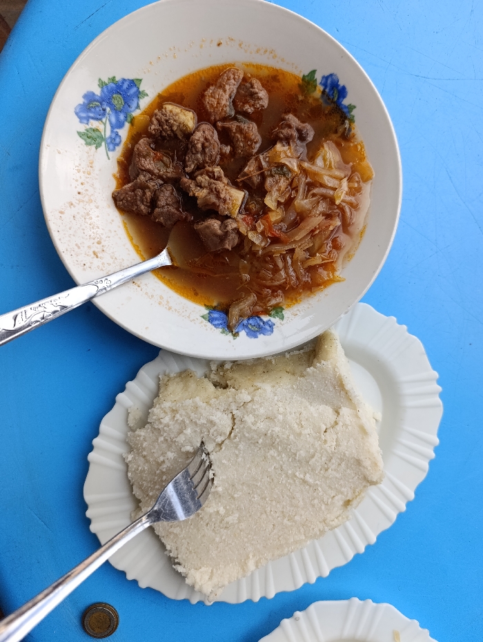 plate of Ugali (a staple food in Kenya, made from maize flour) and a bowl of beef stew with onions and cabbage