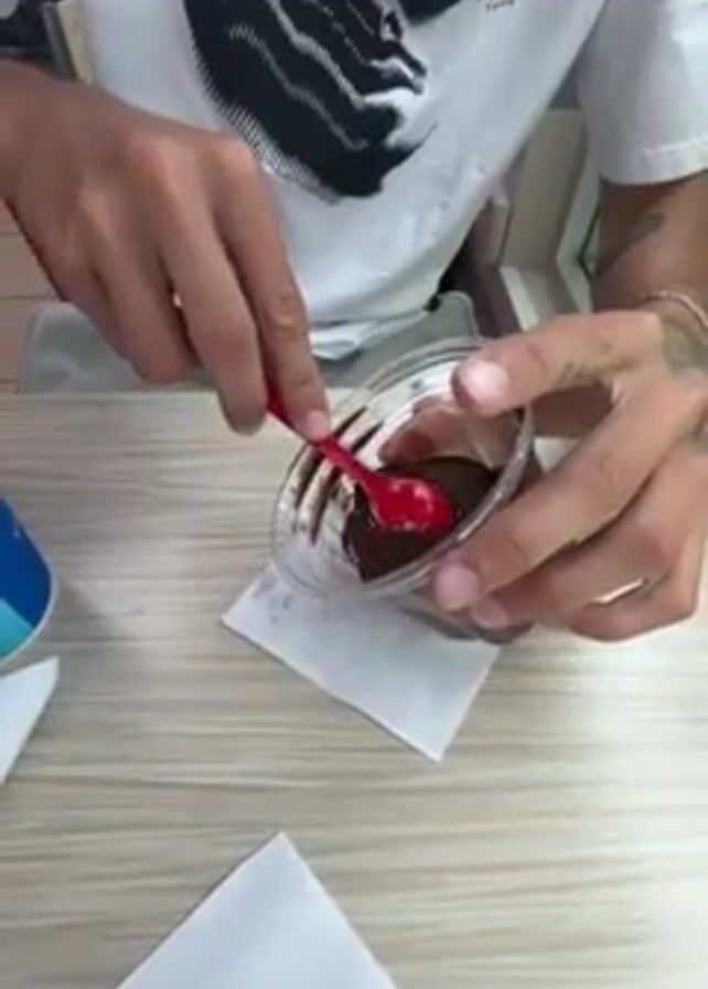 A person with a tattoo on their right forearm is sitting at a light brown table, stirring chocolate pudding in a clear plastic cup with a red plastic spoon