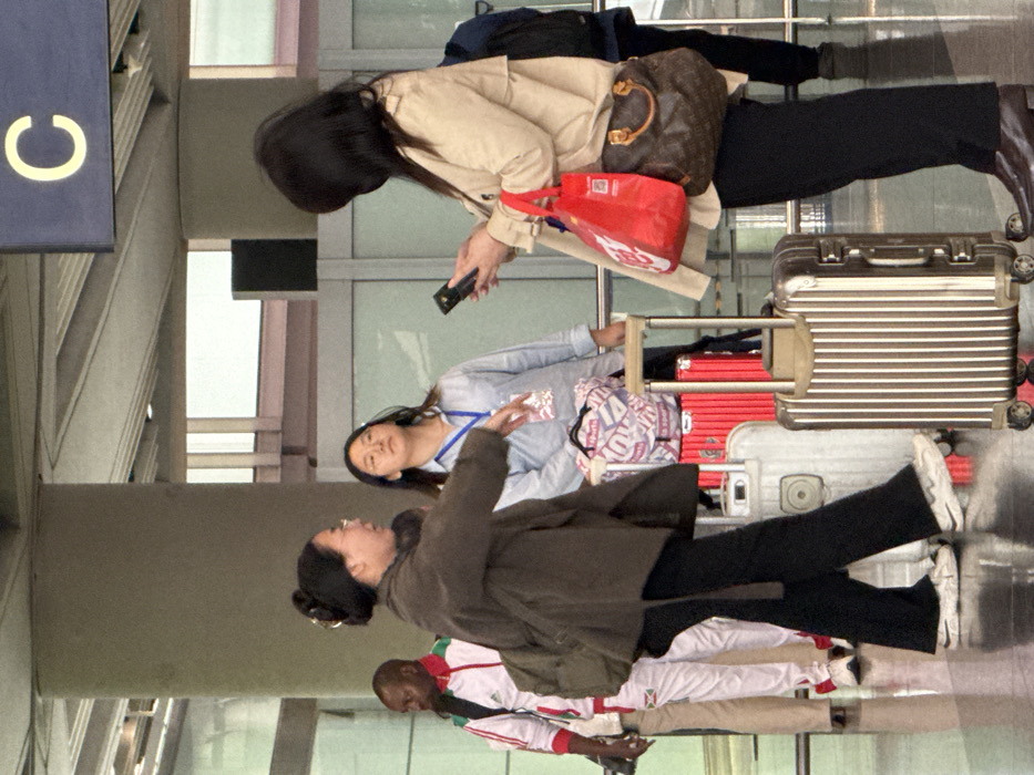 This image depicts an indoor scene within an airport terminal, identified as Beijing Capital International Airport (PEK) in Shunyi District, China. The environment features a polished dark floor reflecting light, large grey structural pillars, and an overhead ceiling with metal framework. A blue overhead sign with a large yellow letter "C" is visible in the upper right. In the foreground, three individuals are prominently featured. On the left, an East Asian female, wearing a dark olive-brown jacket, black trousers, and white sneakers, has dark hair pulled into a bun secured with a gold clip, and wears glasses. She carries a dark green backpack and is captured mid-action with her right arm extended, appearing to speak or gesture, her mouth open. Facing away from her on the right is another East Asian female, with long dark hair, dressed in a light beige trench coat, black trousers, and dark brown shoes. She is focused on a black smartphone held in both hands. She carries a brown Louis Vuitton monogrammed handbag and a red shopping bag with a white logo and QR code. Standing between and slightly behind these two is a third East Asian female, younger in appearance, wearing a light blue collared shirt, glasses, and a blue lanyard with an ID badge; she looks upwards and slightly to the left. Multiple pieces of luggage are present. A silver rolling suitcase with vertical ridges is positioned between the two foreground women. Another silver rolling suitcase is visible behind the woman on the left. A bright red rolling suitcase, topped with a multi-colored duffel bag, is behind the woman in the blue shirt. In the mid-ground on the left, a Black male is partially visible, wearing a white and red tracksuit with green accents and a white backpack bearing an Adidas logo; he appears to be walking towards the left. The scene portrays a bustling travel hub.