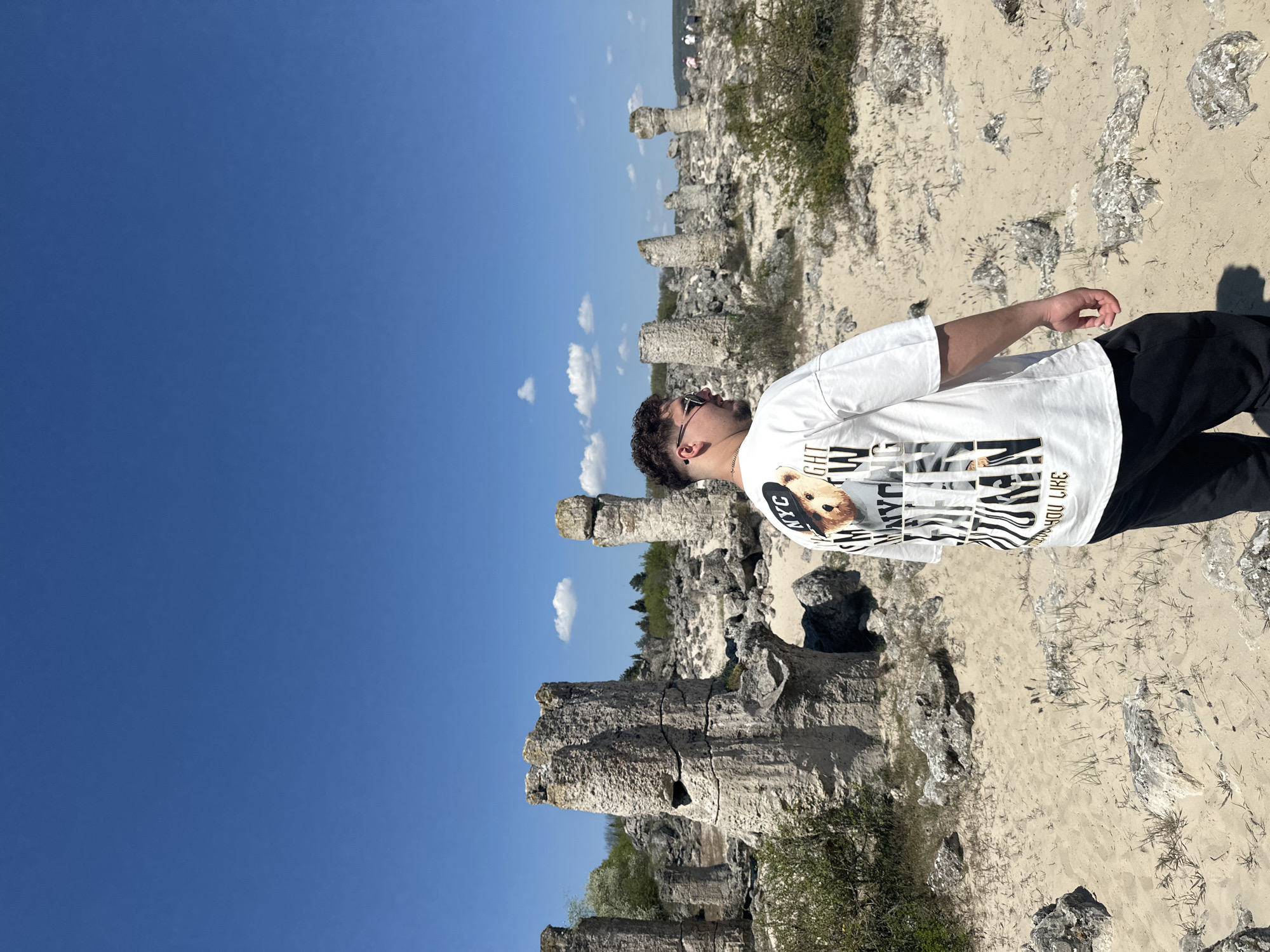A full-length shot of a man standing among the Stone Forest in Slanchevo, Bulgaria. He has dark hair, wears sunglasses, and a white graphic tee shirt, and black pants. The Stone Forest consists of tall, natural stone formations. The ground is covered in light-colored sand and sparse vegetation. The sky is blue with scattered white clouds.