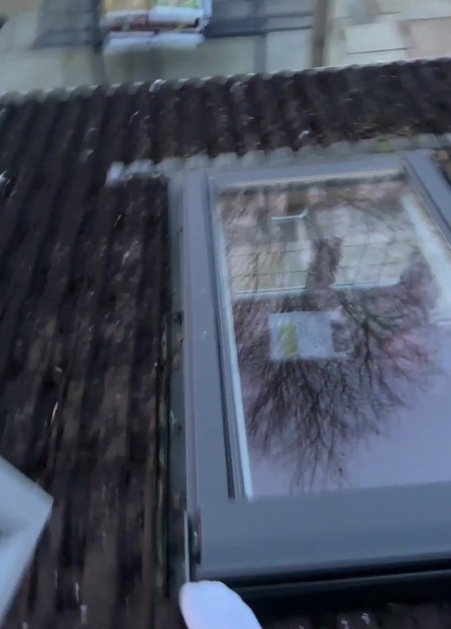 The video opens with a close-up shot of a roof window on a corrugated roof
