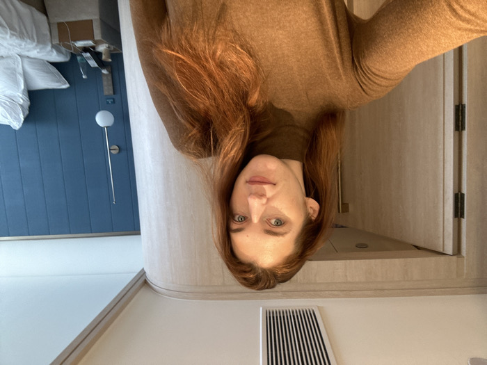 A female individual with reddish-brown hair and light eyes is centered in a close-up, facing the camera directly with a neutral expression. She is wearing a plain, long-sleeved brown turtleneck top. The scene is an interior, indicative of a modern hotel room. To the subject's left, a light-colored wooden door frame is partially visible, with a slightly ajar door beyond, revealing two dark hinges. Above this, a curved architectural element runs along the ceiling line. The white ceiling at the top of the image features a rectangular air vent with vertical slats. To the subject's right, a wall clad in vertical blue panels serves as a backdrop. A section of a bed with white linens and pillows is visible on the far right. A light-colored nightstand is positioned between the subject and the bed, holding a black corded telephone, a clear plastic water bottle, a small white cup, and associated charging cables. A wall-mounted lamp with a spherical white fixture extends from the blue paneled wall above the nightstand. The subject is performing the action of posing for a photograph. No other individuals or direct interactions are visible. The specific location in Licheng District, China, cannot be determined from the visual evidence within the image.