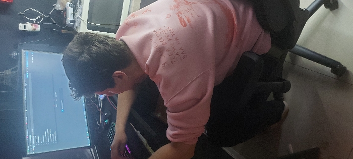 A person wearing a pink hoodie sits in a black chair in front of a large computer monitor displaying lines of code or data. The person is bent over, presumably interacting with the keyboard or mouse. Other items are visible on the desk, including a white game controller and assorted cables. The image is taken in a room with a slightly cluttered appearance.