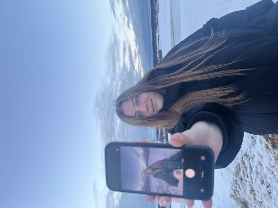 A young adult female, identified by long, straight, light brown hair and blue eyes, is depicted outdoors in a snowy, rural landscape in Zubovo, Russia. She wears a black padded winter jacket and is positioned slightly to the viewer's right, with her head subtly turned left and a faint smile. Her left arm is extended forward, holding a black smartphone horizontally at eye level. The phone's screen is active, displaying a live camera feed or a recently captured image of the same individual standing in a similar snowy environment, facing directly forward. The phone's camera interface, including a white circular shutter button, is visible on the screen. The immediate foreground consists of uneven snow-covered ground with exposed patches of brown earth or vegetation, forming a small mound in the lower-left. Beyond the individual, a wide, flat expanse of snow extends to the horizon, featuring a distinct, possibly frozen body of water or road running horizontally across the mid-ground. A distant treeline or low hills are visible on the horizon. A partially obscured red and white circular road sign on a dark pole is situated behind the smartphone, to the viewer's right of the female's head. The sky above is light blue with scattered white and grey clouds, indicating overcast or transitional light conditions.