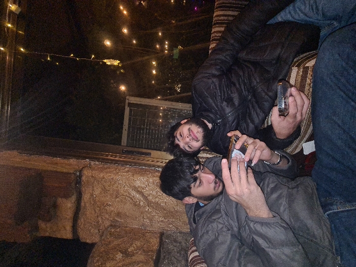 Two men are sitting on a cushion in an outdoor setting. One man wears a black jacket and holds a silver-colored phone. The other man wears a gray jacket and looks at a smartphone in his hands. Behind them, there are lights strung up in the dark, indicating it is night. A structure resembling a rough stone wall is in the foreground, and a window-like object is behind the men. The men appear to be relaxed and engaged with their phones.