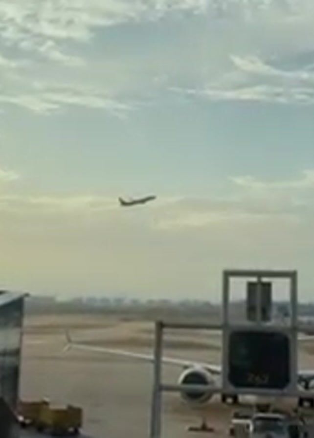 view from inside an airport terminal, looking out onto the tarmac. An airplane is taking off, ascending into a partly cloudy sky. In the foreground, a jet bridge extends towards another airplane parked at a gate. Airport vehicles are visible on the tarmac. The overall lighting suggests it is daytime.