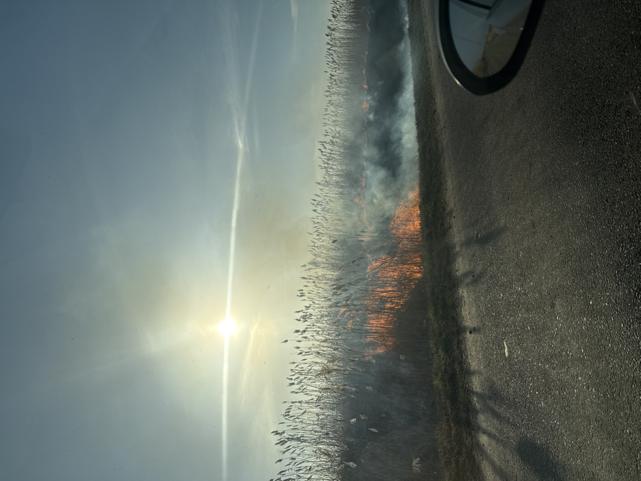 This image depicts a vegetation fire occurring in Pseituk, Russia. The scene captures a field of tall, dry, light-brown reeds or grasses actively burning, with prominent orange flames concentrated along the base of the vegetation, primarily on the left and central-left portions of the frame. Significant plumes of white and grey smoke are rising from the burning area, drifting upwards and to the right. The sun is visible as a bright, glaring light source in the upper-left quadrant of a clear, light-blue sky, casting long shadows onto the dark asphalt road that occupies the foreground. A vehicle's side mirror, black and curved, is partially visible in the bottom-right corner, indicating the perspective from a vehicle. No individuals are visible. The environment suggests an open, possibly rural or semi-rural area adjacent to a roadway, with dry conditions conducive to fire.