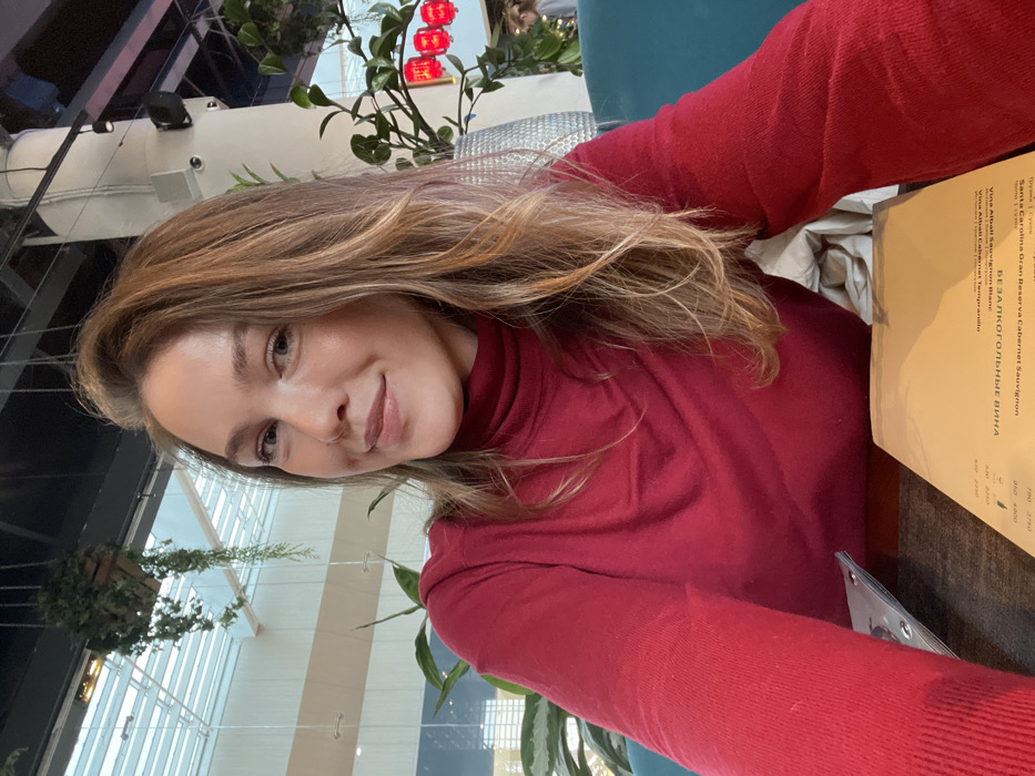 A Caucasian female, appearing in her late 20s or early 30s, is centered in the frame, looking directly at the camera with a slight smile. She has long, wavy, light brown hair with blonde highlights, parted slightly to her left. Her complexion is fair, and she is wearing a solid red turtleneck sweater. The image depicts an indoor scene, likely a cafe or restaurant located in the city of Kommunarka, Russia. In the immediate foreground, a dark-colored table is visible. On the table, a light brown menu is positioned to the right, showing Cyrillic text including "БЕЗАЛКОГОЛЬНЫЕ ВИНА" (Non-alcoholic wines) and price listings. A reflective metallic object, possibly a menu stand or another menu, is partially visible to the left. To the subject's right, a portion of a teal or turquoise upholstered bench or booth seating is present. The background reveals a modern interior. To the left, large windows with a horizontal slat or beam structure are visible, through which diffuse natural light enters. A hanging potted plant with green foliage descends from the ceiling structure. To the right, a large white cylindrical column rises, featuring several mounted fixtures, including a black speaker or light. Behind this column, dense green foliage from another plant is visible, adorned with three small, rectangular red lanterns. A blurry, indistinct figure is faintly discernible in the far right background, partially obscured by the foliage.