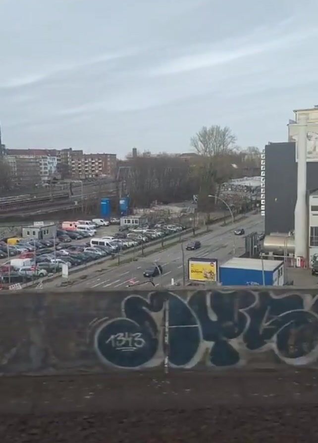 From a train's perspective, the camera faces out towards a city scene. The train tracks are visible in the immediate foreground. A graffiti-covered concrete barrier lies directly in front of the camera. Beyond the barrier, there is a street with cars moving along it. A parking lot filled with vans and cars is adjacent to the street. Buildings of varying heights line the street. Some are brick, some are gray, and some display advertisements for businesses such as "A&O Hostels" and "Premier Inn". The sky is overcast and gray.