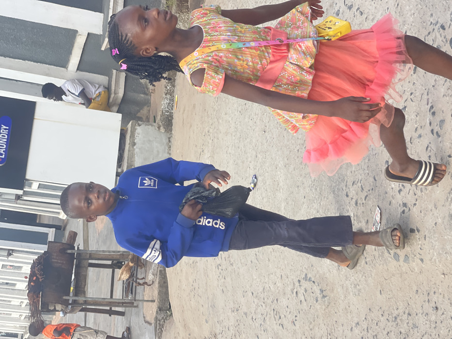The image depicts an outdoor street scene in Neni, Nigeria, featuring two children in the foreground and several other individuals and structures in the background. In the immediate foreground, a young boy with dark skin and short hair walks from left to right. He wears a blue Adidas track jacket with white stripes on the left sleeve and an Adidas logo on the chest, dark trousers, and grey slide sandals. He holds a crumpled black plastic bag in his right hand and looks slightly towards the camera. To his right and slightly behind him, a young girl with dark skin and braided hair styled in pigtails with pink butterfly clips is in mid-stride, moving from right to left. She wears a multi-colored, floral-patterned peplum top with shoulder cut-outs, a wide pink sash, and a voluminous coral/pink tiered tutu-style skirt. A small yellow purse with a rainbow-colored strap is slung across her body. She wears black and white Adidas slide sandals and looks to her right. The ground is a rough, light-colored paved surface with visible cracks and some scattered debris, including what appears to be discarded wrappers. In the mid-ground, behind the children, a rusty metal street food vendor's grill stand is visible on the left, laden with skewers of meat. Another young individual in an orange shirt and light shorts stands near this setup, partially obscured. Further to the right, behind the boy, a man in a white t-shirt and yellow pants sits on a raised concrete ledge or step against a light-colored building. A blue sign with the word "LAUNDRY" in white text is visible above and to the left of the seated man. The background consists of modern, light-colored buildings with multiple windows and doors, indicating a commercial or residential street.