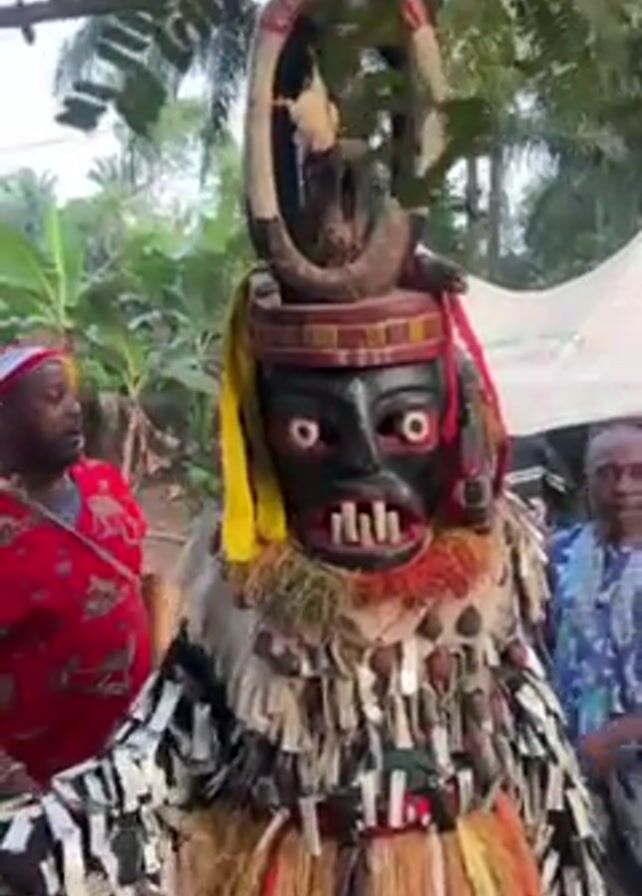 person dressed in a traditional African masquerade costume, complete with a large mask and elaborate coverings made of fabric, straw, and other materials. The mask is black with white eyes and prominent teeth. The masquerader is performing in an outdoor setting, surrounded by people in casual clothing, some of whom are filming or watching. There are trees, tents, and blue chairs visible in the background, suggesting a festive or ceremonial event. The masquerader is moving, gesturing with their arms, and interacting with the crowd.