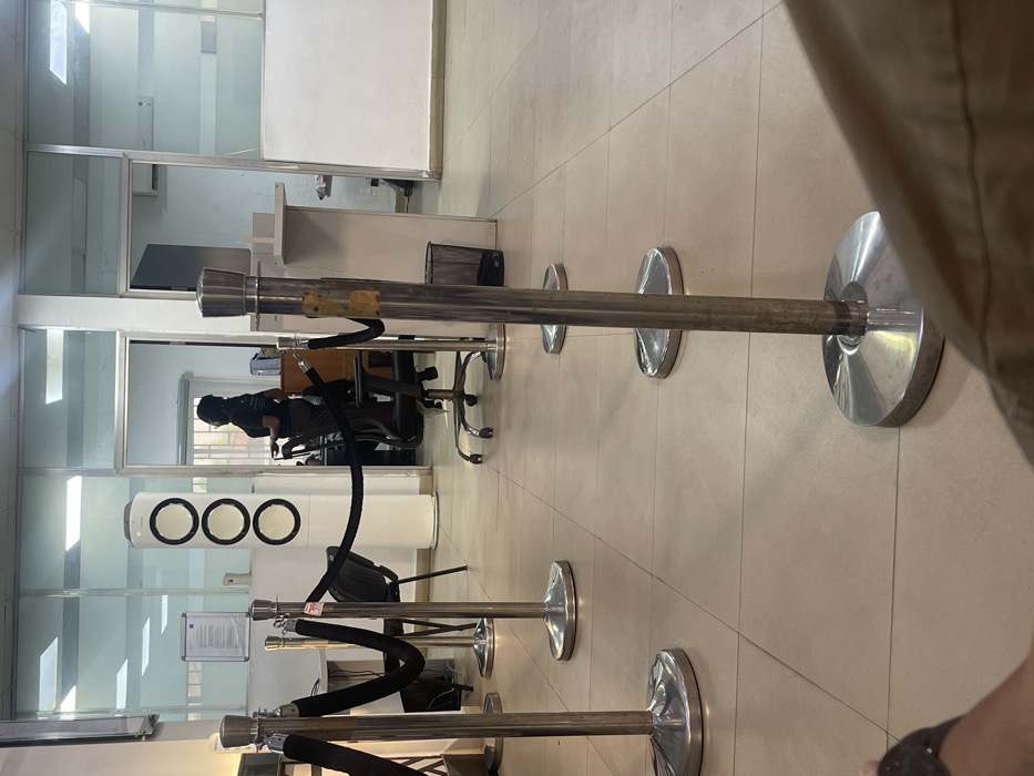 The interior of an office or waiting area is visible. A person sits in a chair behind a desk in the background. Prominent in the foreground are a series of stanchions with metal poles and bases, connected by black ropes, used to manage queues. A white structure with circular openings is positioned to the left. The floor is tiled and the walls are glass. A piece of clothing is slightly visible in the right corner.