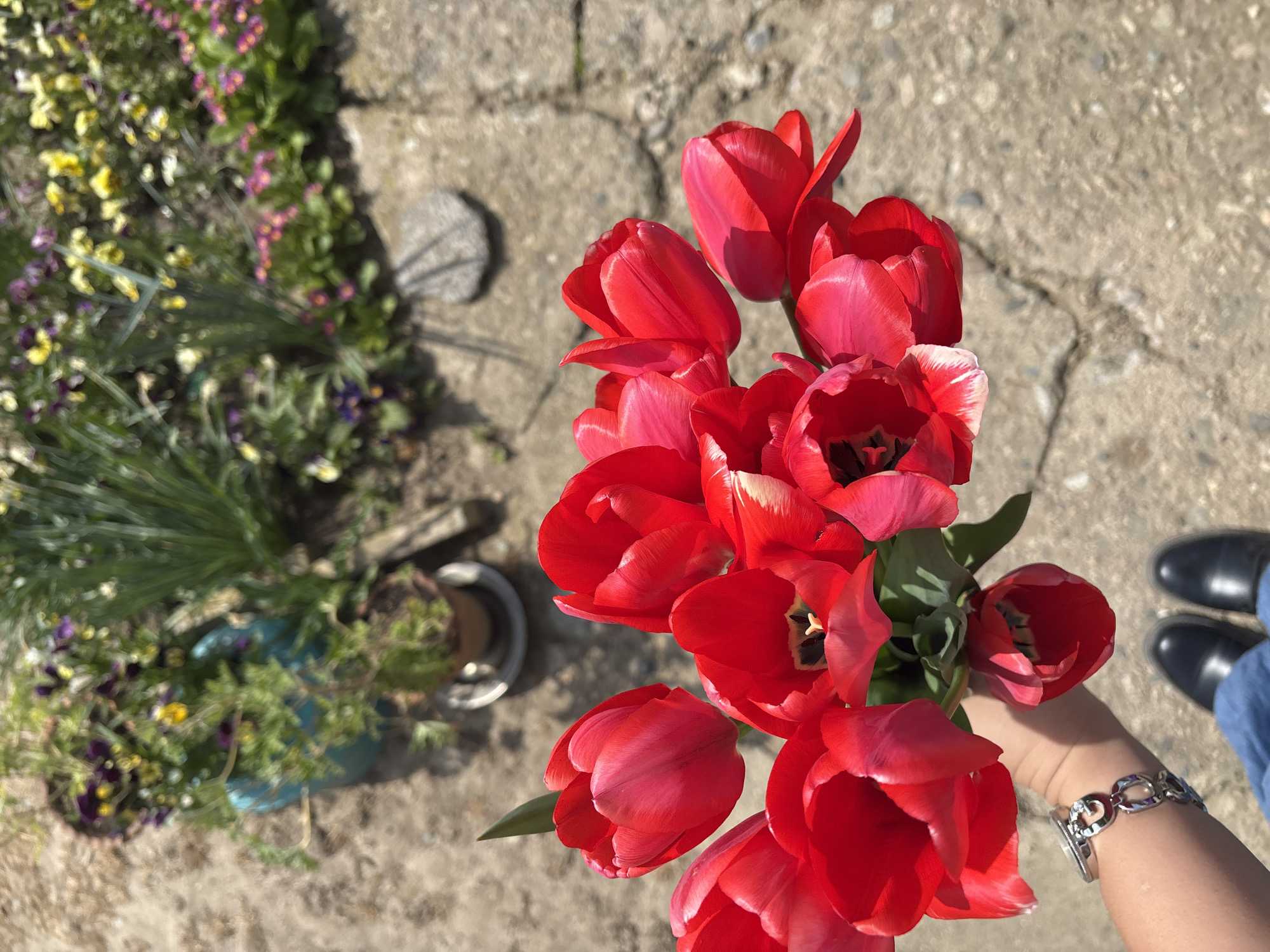 - "A person stands on a cracked concrete surface, possibly a sidewalk or courtyard, holding a bunch of red tulips in their right hand" by FM-Mwsev1, licensed under CC BY 4.0
