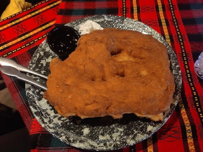 - "A high-angle, close-up photograph captures a single serving of fried dough pastry presented on a speckled plate, situated on a patterned tablecloth" by FM-bS7EF2, licensed under CC BY 4.0