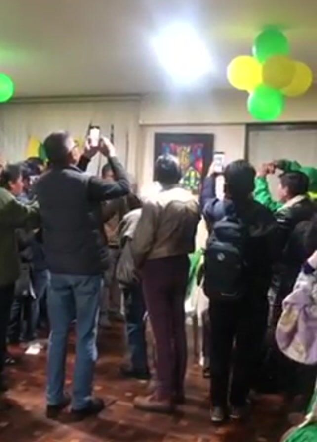 A group of people are gathered in a room, most of them taking pictures or videos with their phones. They are facing towards the center of the room. Some are clapping. The room is decorated with green and yellow balloons. There is a framed piece of art on the wall. The floor is made of wood. The light is provided by an overhead fluorescent fixture.