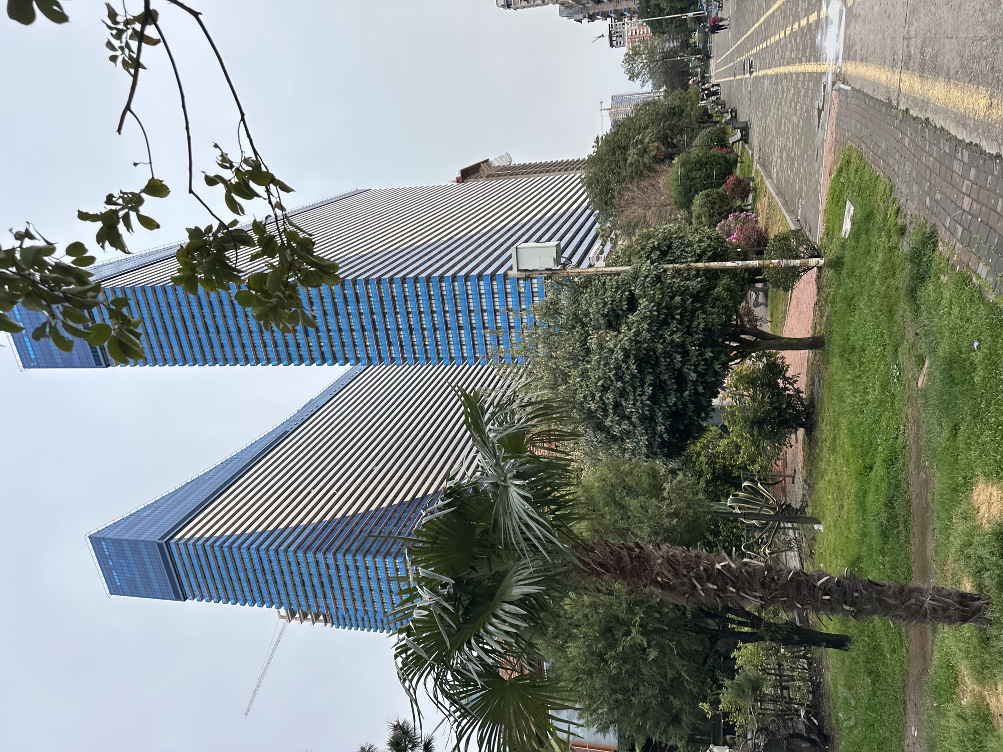 two tall, modern buildings with a blue and white striped design in Batumi, Georgia. A palm tree and other greenery are in the foreground. A sidewalk with yellow stripes runs along a park-like area with trees, flowers, and grass. In the distance, people can be seen walking along the sidewalk. The sky is overcast.